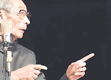 照片:2001年12月8日马三立在告别演出上表演相声《逗你玩儿》。