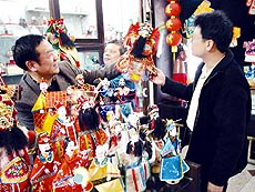 2月16日,福建泉州锦绣庄木偶艺术馆馆长曾焕强(左)向台湾客商介绍泉州木偶。锦绣庄木偶艺术馆通过收藏和开发生产传统木偶,向人们展示了闽南古老文化艺术的独特魅力。这里成了海峡两岸同胞民间文化交流的场所,每年都会吸引数百名台胞来此观赏木偶戏、采购木偶艺术品。新华社记者张生贵摄