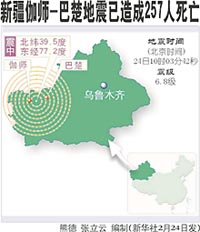 今天上午10时03分,在新疆维吾尔自治区巴楚―伽师地区发生6.8级强烈地震(震中位于北纬39.5度,东经77.2度),使人民的生命财产遭受严重损失。截至22时,巴楚伽师地震已造成257人死亡,上千人受伤。