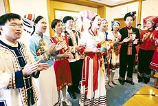 照片:7月23日,广西代表团的小组讨论会上气氛热烈。在休息之余,能歌善舞的广西少数民族代表将自己的心情感想写成歌词,用山歌的形式演唱以表达对共青团事业的美好憧憬。本报记者