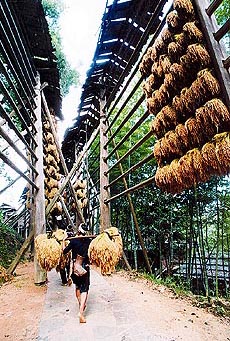 当地人说,禾晾能否挂满代表着当年的收获状况,而禾仓的大小也标志着一个家庭的富裕程度。出嫁的女儿是被严禁攀爬的,只有本家人才能爬上禾晾挂晒当年的新糯禾。