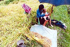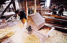 | ▲妇女用脱粒机来加工晾干的糯禾。这种“半自动”的脱粒机也是近五年才在岜沙出现的,以前都是用手搓、脚踩。 |