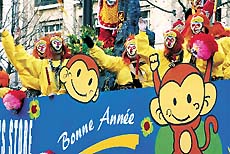 在法国巴黎香榭丽舍大街上,装扮成“猴”形象参加中国春节大游行的演员们向人们祝“猴年好”。