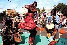 ▲来自非洲的演员参加北京平安大街上的国际盛装行进表演。(2000年9月9日)本报记者 江菲摄