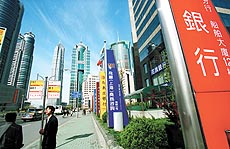 ▲上海浦东街头林立的外国银行。(2001年4月24日)本报记者 李建泉摄
