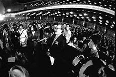 ▲人民代表黄顺兴在七届人大一次会议现场发表反对意见。这是人代会上第一次公开出现的不同声音。(1988年3月28日)本报记者 贺延光摄