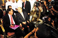 ▲世界贸易组织官员在卡塔尔首都多哈正式宣布中国加入WTO。会后,中国代表团成员接受记者采访。(2001年11月10日)本报记者 杨得志摄