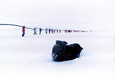 ▲中国南极考察队员在中山站附近海域进行一年一度的燃油卸载,人们扛着200米长的输油管走过冰海。(1999年1月4日)本报记者 叶研摄