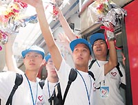 今天,54名参加2004年大学生志愿服务西部计划的第二批志愿者,从北京西站出发踏上征途。