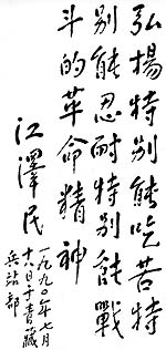 月4日电 中央军委主席江泽民1990年7月18日到总后勤部青藏兵站部视察时题词:“弘扬特别能吃苦,特别能忍耐,特别能战斗的革命精神”。