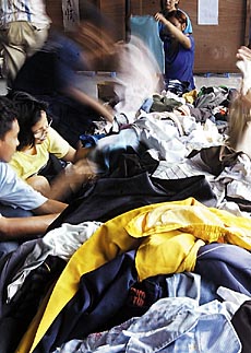 | ▲1月12日,从班达亚齐、美拉务等地逃出的华人难民,在棉兰“美达村”华人救济站分领捐赠的衣物。 |