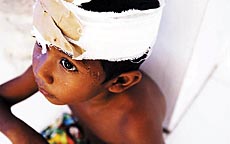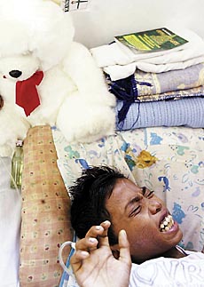 ▲1月8日,10岁的ARMIA在海啸中失去父母,他一个人挣扎到1月6日才被送到一家医院,浑身伤痛让他整日难眠。 |