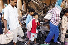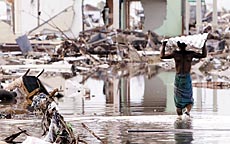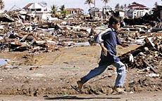 ▲1月11日,班达亚齐已是一片废墟,拾荒的孩子在废墟中匆忙奔跑。 |