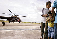 ▲1月9日,从美拉务逃到班达亚齐的孩子在军用机场等待回家。由于陆路交通中断,军用飞机又以运送物资为主,每架次只能顺带10到40人。 |