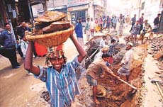 ▲1月17日,达卡城里正在修理管道的工地上,一位搬运工面对镜头露出了灿烂的笑脸。