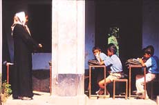 ▲1月17日,孟加拉前首都Sonargaon老街里的一所小学校,身穿传统服装的女教师在为学生上课。