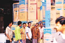 ▲1月16日,达卡的批发市场里摆满来自中国的电器商品。过去两年中,中孟两国的贸易额超过了10亿美元。