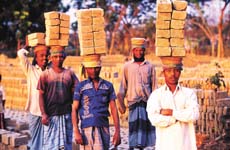 ▲1月20日,达卡城边的一家砖厂,工人们用头顶着运送砖坯。