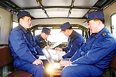 3月17日一大早,防化营官兵接到上级命令后,迅速备好装备,启动车辆。在指挥通信车引导下,由10余台防核、生、化特种专用车辆组成的车队向大山深处进发。在受“敌”袭击的山麓上,官兵们及时展开工作,分别对“敌方”袭击使用的核、化及生物武器进行了侦察化验,并准确测定了侵坏范围。随后,他们根据不同侵害种类采取了化学洗消处理。突然,接到空袭警报,战士们紧急跳车,冲入洼地树林疏散隐蔽,整个演练过程紧张有序。