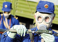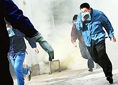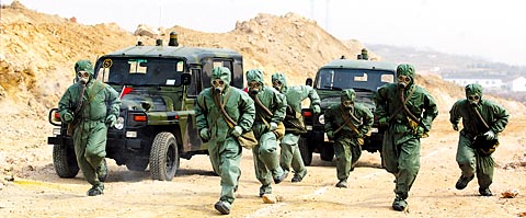 ▲某化工厂的工人在防化兵的指挥下,紧急脱离染毒区。 |