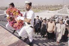 ▲4月3日,卡拉奇,中国百人青年代表团向巴基斯坦国父真纳的陵墓敬献花圈。