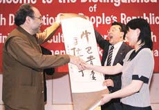 ▲4月6日,伊斯兰堡,代表团总团长尔肯江?吐拉洪(中)向巴基斯坦青年部官员赠送中国书法作品。该作品由代表团成员、著名书画家陈可之先生创作。
