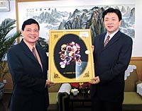 照片:团中央书记处书记杨岳(右)与越南青年报总编辑阮公契互赠纪念品。本报记者 陈剑摄