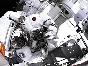 这张由美国航天局7月30日公布的影像照片显示的是日本宇航员野口聪一在进行太空行走。当日,野口聪一和美国宇航员斯蒂芬?鲁宾逊成功进行了“发现”号航天飞机此次飞行任务中的第一次太空行走。在约6个小时46分钟的太空行走期间,两名宇航员做了受损绝热层模拟修复试验,恢复了一个陀螺仪的电力供应,并检查了“发现”号航天飞机表面绝热层的受损情况。