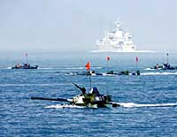 王经国)空中、海上、地面立体突防,前沿、翼侧、纵深全域攻击,抢滩、夺点、阻援同步展开……24日上午,参加“和平使命―――2005”中俄联合军事演习的中俄两军部队在山东琅琊台地区举行了两栖登陆作战演练。