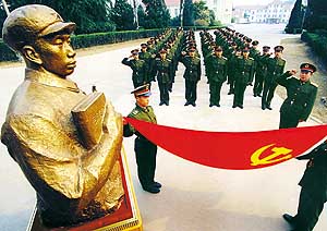 照片:战士们在王杰的铜像前宣誓。 王华胜 邓元生摄
