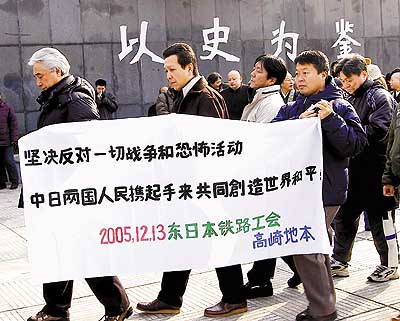 12月13日,来自东日本铁路工会的日本友人悼念在南京大屠杀中遇难的中国同胞。当天,江苏省暨南京市在侵华日军南京大屠杀遇难同胞纪念馆举行国际和平集会,沉痛纪念南京大屠杀30万同胞遇难68周年。