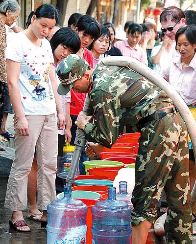 7月19日,消防战士为韶关市居民供水。受台风“碧利斯”引发的洪水影响,广东省韶关市全城大面积断水数日,市政府采用紧急措施,用消防车为市民供水,预计本周有望恢复正常供水。