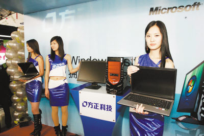 操作系统。图为微软与国内电脑制造商方正科技在中关村举办体验活动,后者展示了5款装有Wi n d o ws V i s t a