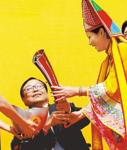 5月10日,第七届全国残运会组委会执行副主席、中国残疾人联合会常务副理事长吕世明(左)用火种点燃传递火炬。