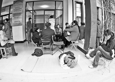 照片:2006年3月5日下午,杭州市“老托福”考试最后一次发放报名表,大批欲赶“老托福”末班车的报名者从四面八方赶来,通宵排队。胡元勇摄(资料图片)