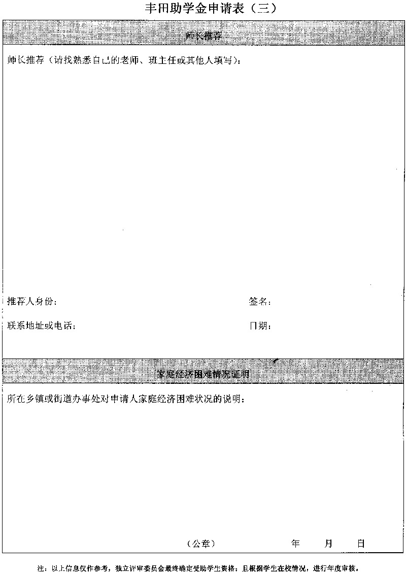 同时,《丰田助学金申请表》将刊登于《中国青年报》高考特刊,申请者可以复印或按照项目公布的表格格式自行制作。