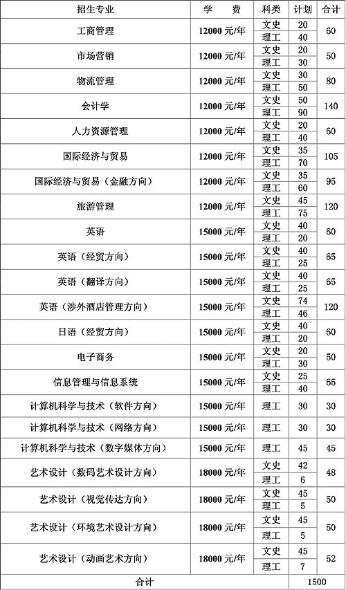 学院是以经济学和管理学为主,兼有工学、文学、艺术学的多科性全日制普通高等学校。目前,设有国际工商管理系、涉外经济贸易系、外国语言文学系、计算机与信息技术系,共有工商管理、会计学、市场营销、物流管理、人力资源管理、国际经济与贸易、旅游管理、英语、日语、计算机科学与技术、电子商务、信息管理与信息系统、艺术设计等13个本科专业,已有在校本科生5000余人。