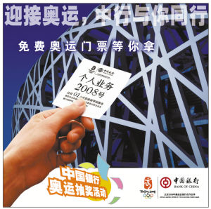 |        近日从中国银行获悉,为弘扬“梦想”与“激情”的奥运精神,激发全民参与奥运的热情,自2007年7月起到2008年北京奥运会开幕前,中国银行将利用作为奥运合作伙伴所享有的珍贵奥运门票权益回馈社会,以奥运概念的金融产品和服务为依托,在全国范围内分阶段开展“中国银行奥运大抽奖”活动。    中国银行“奥运门票大抽奖”活动将分为两个阶段进行。07年为第一阶段,主题为“迎接奥运,中行与你同行”,第二阶段活动将贯穿2008年上半年,主题为“喝彩奥运,中行与你共赢”。抽奖活动几乎囊括了中国银行所有个人金融产品,包括奥运成长账户、珍藏版奥运福娃存单、奥运申购账户等以奥运为题材的奥运金融产品,还包括“理想之家”消费贷款、“中银汇兑”因私结售汇、“中银理财”贵宾理财服务等业务。抽奖活动设立金奖、银奖、铜奖以及纪念奖共4个奖项,中国银行将提供上千张北京2008年奥运会门票和数万份精美礼品,其中包括奥运会开、闭幕式门票、各项奥运会比赛门票以及各类奥运纪念品,预计中奖率高达千分之一。    中国银行在大力传承奥运文化的同时,将把“更快、更高、更强”的奥林匹克精神融入到银行经营管理的各个方面,秉承“以客户为中心,以市场为导向,强化公司治理,追求卓越效益,创建国际一流大银行”的经营宗旨,不断提高服务水平,创新服务产品,拓宽服务领域,在实现与客户“共享奥运”的过程中,使客户充分体验中国银行的金牌服务品质,更好地为客户、为社会创造价值。     |