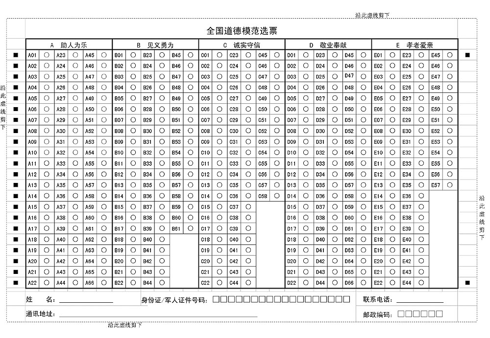 2.投票范围为主办单位确定的308位候选人,候选人按姓氏笔划排序。评选奖项共分五大类:全国十大助人为乐模范、全国十大见义勇为模范、全国十大诚实守信模范、全国十大敬业奉献模范、全国十大孝老爱亲模范。