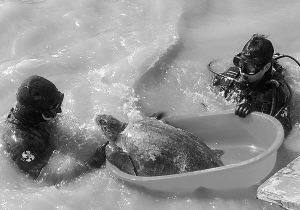 10月23日,潜水员将小海龟放归大海。当日,上海海洋水族馆在杭州湾东海大桥附近海域将5只伤愈康复的幼龄海龟放归大海。这5只海龟是渔民在海中误捕后送交渔政部门,委托海洋馆救助并“收养”的。经过一年多“疗养”,小海龟已具备放归海洋的条件。