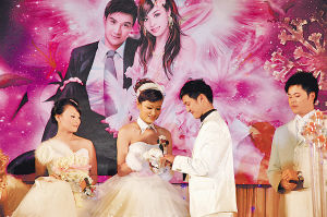 照片:11月29日,田亮(右二)和叶一茜(左二)在婚礼上互换戒指。当日,前奥运会冠军田亮和叶一茜在西安举行了婚礼。新华社记者周欣摄