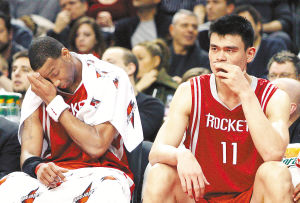 照片:12月10日,难掩失望之情的火箭队球员姚明(右)和麦蒂坐在替补席上。新华社/路透