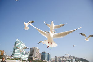 釜山,与日本对马岛隔海相望。在釜山看海,海云台的沙滩和影岛的太宗台都是不错的去处。太宗台,据说是因古代朝鲜半岛新罗王朝时期的太宗武列王曾巡游到此而得名。太宗台现在是一个公园,松荫蔽道。园内的游览车也相当舒适,免去了游人从山道走到海边的一大段路。下到太宗台上,天气好的时候,说是可以看到对马岛。虽说太宗台也颇有几分险峻,但登临之际,浪漫的气息更浓一些。据说,韩剧《巴黎恋人》,也在这里取过景。海云台的沙滩相当明净,与釜山海洋馆相邻。坐在沙滩上小憩,成群的海鸥会云集在你身边。游过欧洲的人,大概都会记得在或大或小的城市广场上喂鸽子的情景。你也可以在釜山的海滩上,体验一下像喂鸽子一样喂海鸥的乐趣。不过当海鸥向你俯冲的时候,可不要害怕。
