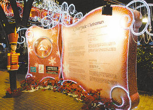 已经拥有24年历史的新加坡圣诞亮灯仪式,是热带圣诞系列活动的重头戏。今年亮灯仪式以“童话圣诞”为主题。著名的购物街——乌节路至滨海湾,幻化成为一片晶莹闪烁的水晶森林,七彩的水晶灯和魔法竖琴以及闪烁着宝石般光泽的红色、金色、白色光束,衬托着五彩缤纷的旋转木马,营造出梦幻仙境一般的童话世界。