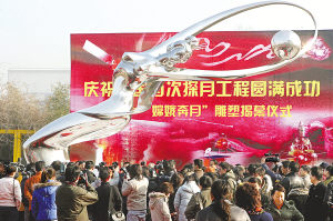 12月19日,为庆祝我国首次月球探测工程圆满成功,大型雕塑“嫦娥奔月”在北京航天城中国空间技术研究院落成。“嫦娥奔月”由中国著名雕塑家遥远创作,高6.6米,宽13.2米,用优质不锈钢精锻而成。