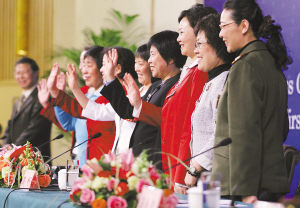 照片:3月8日,8位女代表在两会新闻中心接受中外记者集体采访。本报记者 贺延光摄