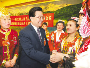 照片:胡锦涛同女代表亲切交谈,并代表党中央向出席两会的女代表、女委员,向全国各族各界妇女致以节日的祝贺。新华社记者 刘卫兵摄