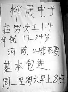 眼下正是不少企业的招工旺季,然而,一边是缺工,一边却是“歧视”。4月10日,记者在江苏省昆山市一家职介公司看到,一企业招工简章上明确注明:河南、山东人员不要。不少求职者对此表示疑惑和反感,称属于地域歧视,而招聘方解释是为了方便管理。 李俊锋摄