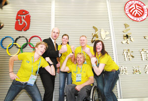 4月14日,在北京大学体育馆(2008年奥运会乒乓球比赛场馆),瑞典首相赖因费尔特(左二)和来京参加“好运北京”2008年国际射联世界杯赛的瑞典运动员、教练一起摆出“中国功夫”姿势合影。当日,赖因费尔特在北京大学发表演讲,并参观北京大学体育馆。