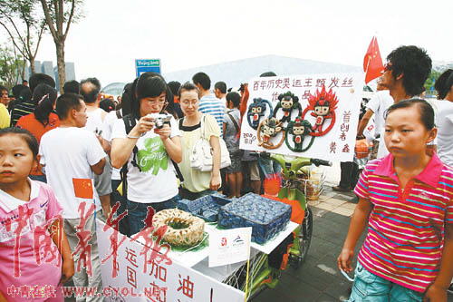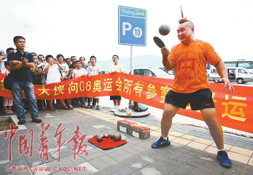 8月11日,北京奥林匹克公园附近,号称“铁球大侠”的谢家军用乒乓球拍颠铅球,赢来周围群众的一片喝彩。谢家军今年45岁,是哈尔滨一名普通职工,练这个铁球绝技20余年。起初练习是为了强身健体,后来苦练则是为了冲击吉尼斯世界纪录。他说,奥运的精髓重在“参与”,他想向所有力量型选手挑战,同时也以这种特殊的方式为在场内拼搏的运动员加油鼓劲。